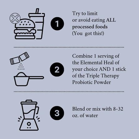 - Combine 1 serving of the Elemental Heal of your choice AND 1 stick of the Triple Therapy All-In-One Probiotic Powder