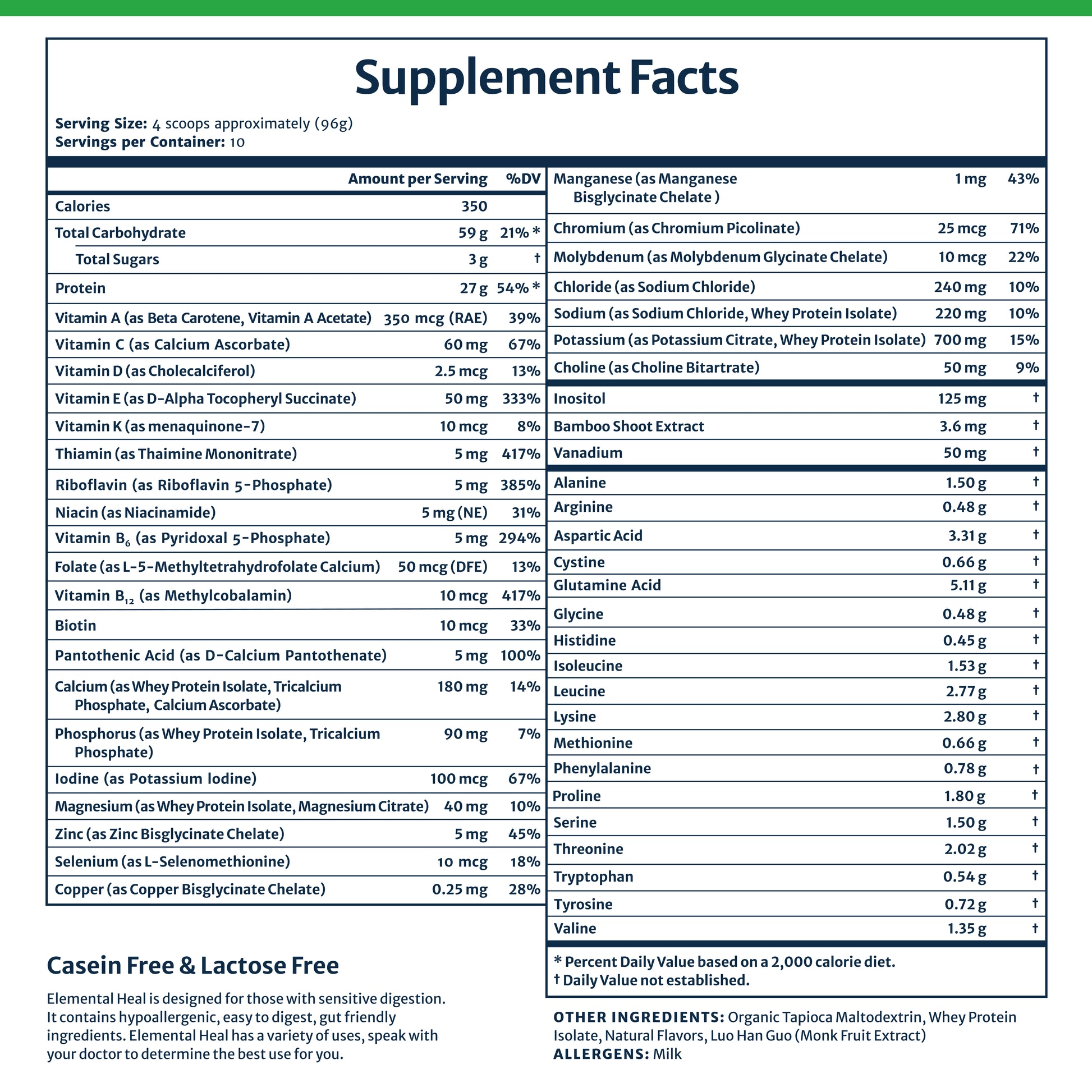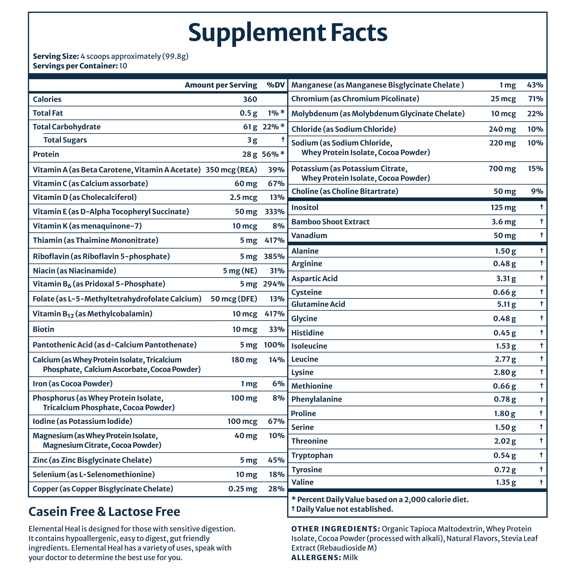 - Elemental Heal is casein free. The amount of lactose it contains is ≤ 3% and is low enough that many people who normally don't do well with lactose are able to tolerate Elemental Heal with no problem.