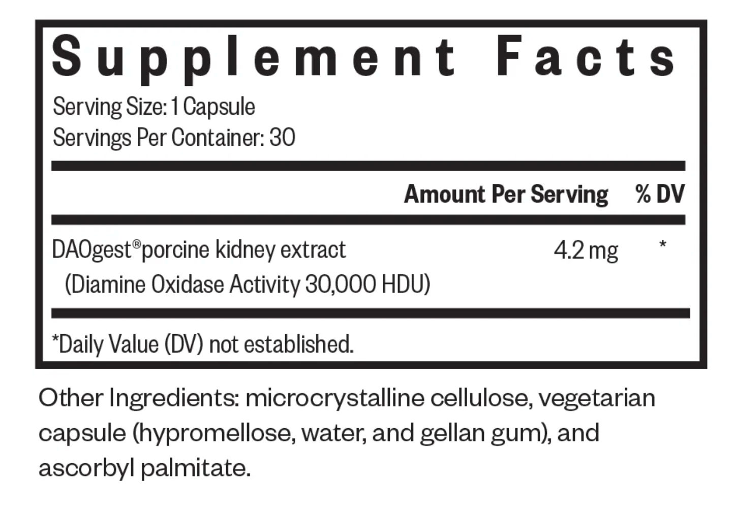 Formerly known as "Histamine Block", Histamine Digest by Seeking Health contains a patented enzyme formula providing 10,000 HDU of diamine oxidase (DAO) - the main enzyme responsible for the degradation of ingested histamine - per capsule. Key Benefits and Actions* • May help support digestion of food-derived histamine in the digestive tract* • Enhances the presence of diamine oxidase (enzyme) in the digestive tract* • Patented material with optimized stability • May help support normal inflammatory responses in the digestive tract*