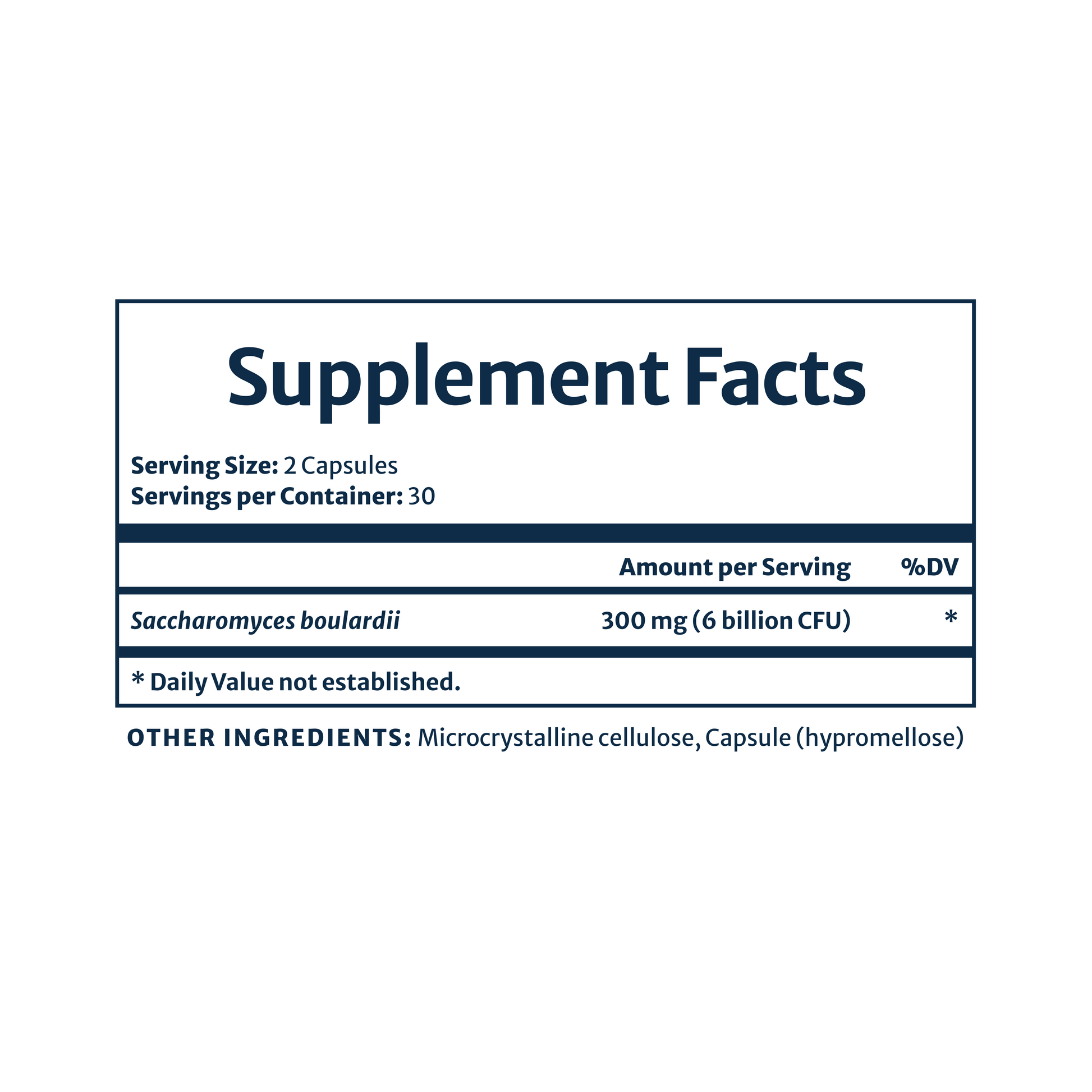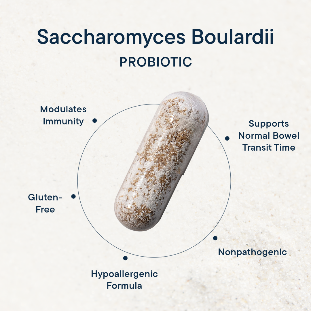 Sacchromyces Boulardii Probiotic is a nonpathogenic, transient yeast long used to support normal bowel transit time.